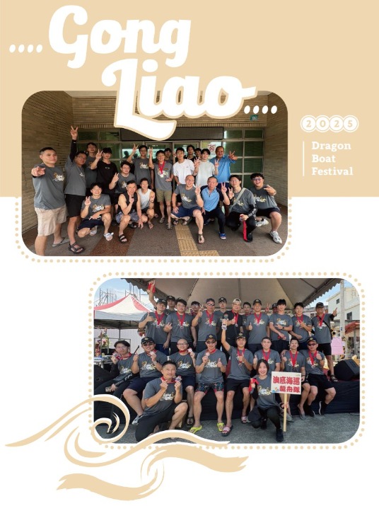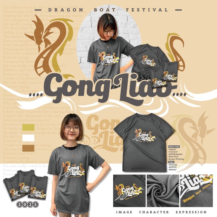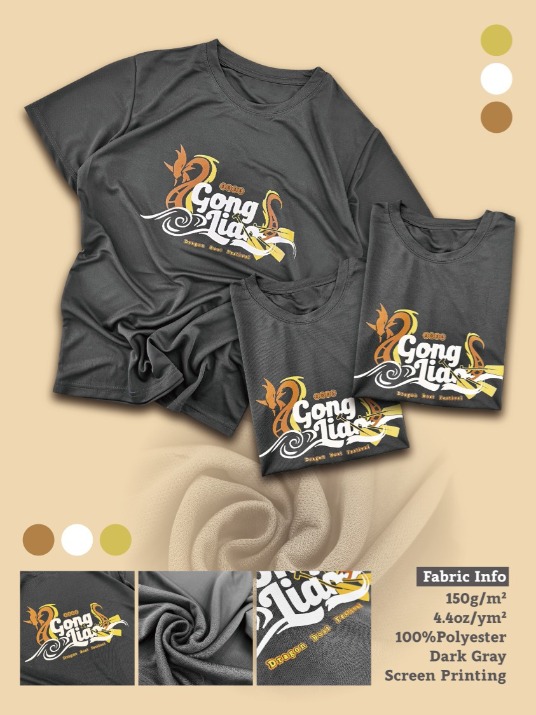 這款為貢寮龍舟隊量身打造的涼感T恤,不單只是一件衣服,更是一種團魂的象徵。 設計靈感來自龍舟的力量與海浪的律動,結合書法風格字體與動態圖騰,營造出視覺張力。 以深灰色為主調,沉穩中不失專業,搭配黃白撞色絲帶點綴,象徵榮耀與勝利。